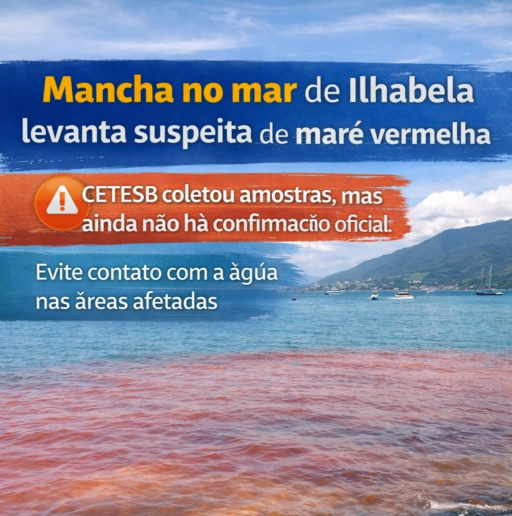 Mancha avermelhada no mar de Ilhabela está sob análise da CETESB. Suspeita é de maré vermelha, mas não há confirmação oficial até o momento.